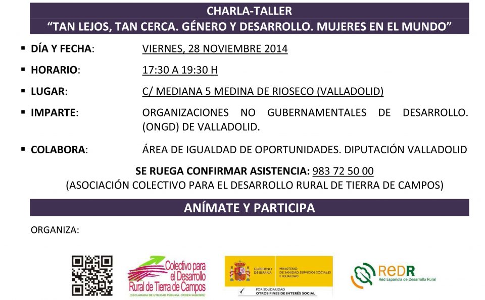 El próximo viernes día 28 de noviembre de 2014 se celebrará la charla taller´Tan Lejos, Tan cerca . Género y Desarrollo. Mujeres en el Mundo´ en horario de 17:30 a 19:30 horas.