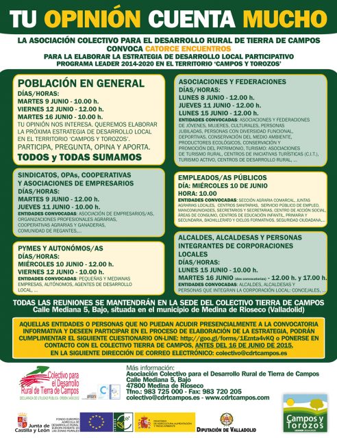 La ciudadanía en su conjunto, las entidades locales, las asociaciones y colectivos, las empresas, los centros educativos, las personas emprendedoras,… todos los grupos de interés que actúan y forman el territorio ‘Campos y Torozos’ pueden participar con sus ideas, aportaciones y conocimientos de dos formas; bien cumplimentando este cuestionario on-line: http://goo.gl/forms/1Eznta4vKQ o asistiendo y participando en los diferentes encuentros monográficos que se han convocado en Medina de Rioseco, entre el 9 y 16 de junio de 2015.