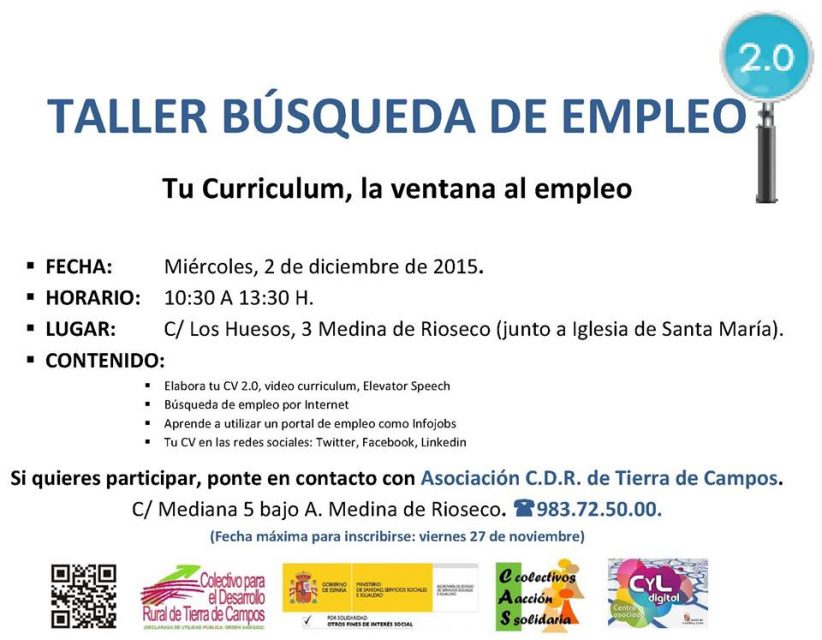 El Colectivo Tierra de Campos y la Red CyL Digital organizan en Medina de Rioseco, un «Taller de Búsqueda de Empleo 2.0», que se celebrará el próximo 2 de diciembre de 2015, desde las 10.30 a las 13.30 h.