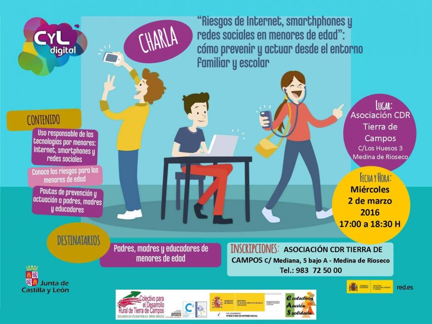 El Colectivo Tierra de Campos y la Red CyL Digital organizan en Medina de Rioseco, una charla GRATUITA sobre los «Riesgos de Internet, smarthphones y redes sociales en menores de edad: cómo prevenir y actuar desde el entorno familiar y escolar», que se celebrará el próximo 2 de marzo de 2016, desde las 17.00 h. a las 18.30 h. Dirigida especialmente a padres, madres y educadores de menores de edad.