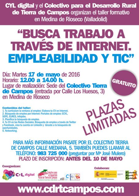 El próximo 17 DE MAYO se impartirá en Medina de Rioseco un taller formativo denominado ´Busca trabajo a través de internet. EMPLEABILIDAD Y TIC.´