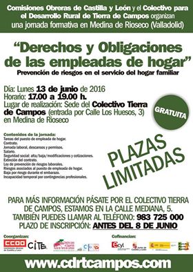 El lunes 13 de junio, de 17:00 a 19:00 horas, Comisiones Obreras de Castilla y León junto con la Asociación CDR Tierra de Campos han organizado una jornada formativa sobre los “derechos y obligaciones de las empleadas de hogar y prevención de riesgos en el servicio del hogar familiar”. El contenido de la jornada versará sobre las tareas del puesto de empleada de hogar, contrato, jornada laboral, descansos y permisos, salario, seguridad social, extinción del contrato, baja por riesgo durante el embarazo, incapacidad temporal por contingencias profesionales. Es un tema de interés, tanto para empleadores/as como empleados/as por las dudas que suscita la relación laboral de carácter especial del servicio del hogar familiar.