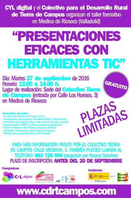 Más información e inscripciones antes del 20 de septiembre, en horario de mañana, en el teléfono 983 725 000 o en la sede de la Asociación Colectivo para el Desarrollo Rural de Tierra de Campos en la calle Mediana, número 5, bajo A de Medina de Rioseco.