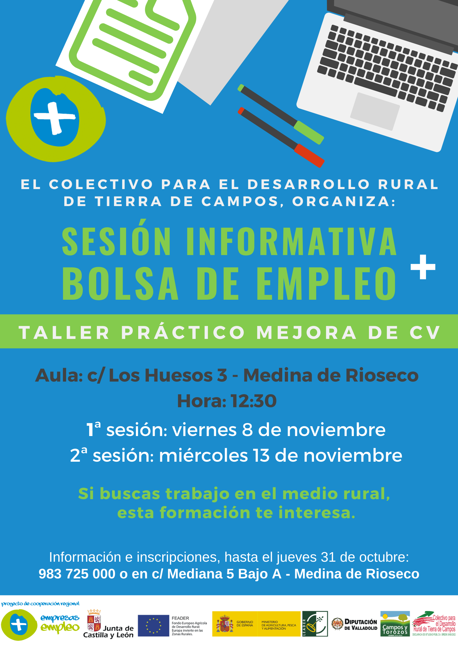 La Asociación Colectivo para el Desarrollo Rural de Tierra de Campos en marco del Proyecto de cooperación +Empresas +Empleo ha organizado dos sesiones en el mes de noviembre principalmente orientadas a personas desempleadas que quieran informarse sobre la bolsa de empleo del Colectivo Tierra de Campos y mejorar o hacer su curriculum vitae. Se llevarán a cabo en el aula de informática de la calle Los Huesos de Medina de Rioseco los días 8 y 13 de noviembre a las 12:30 horas.