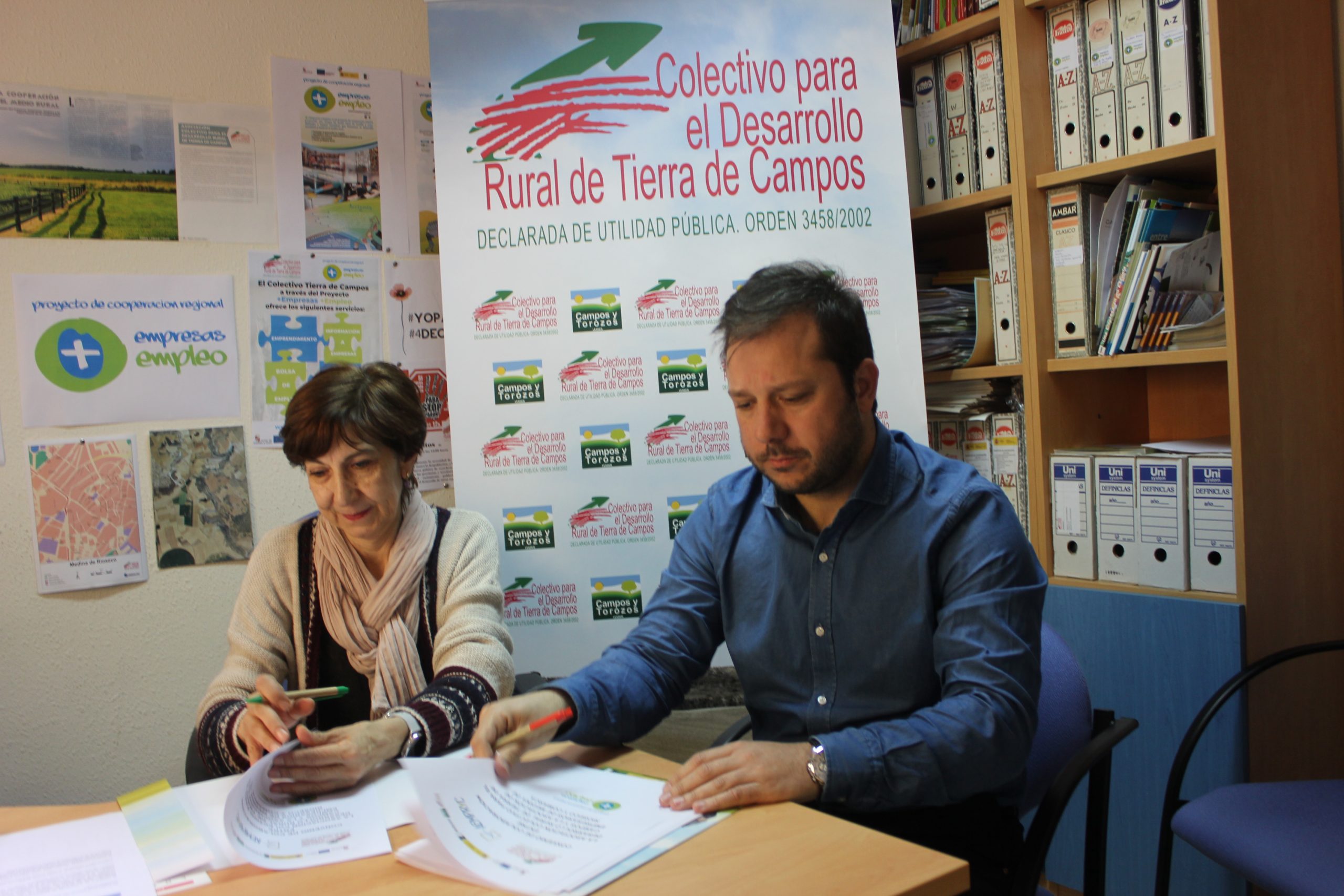 El Presidente de la Asociación de Empresarios y Profesionales de Medina de Rioseco y Comarca, D. Francisco de la Iglesia Represa y la Presidenta de la Asociación Colectivo para el Desarrollo Rural de Tierra de Campos, Dª. Mª Luz Gutiérrez Vaquero, han firmado un Convenio de Colaboración que tiene por objetivo trabajar en coordinación entre ambas entidades para crear y poner en marcha iniciativas sobre encuentros tecnológicos entre empresas, la promoción de empleo, la generación de nuevas empresas y el impulso de medidas que favorezcan la consolidación de las existentes con la finalidad de que mejore los tejidos sociales, laborales y económicos del territorio de actuación, en el marco del Proyecto de cooperación +Empresas +Empleo.