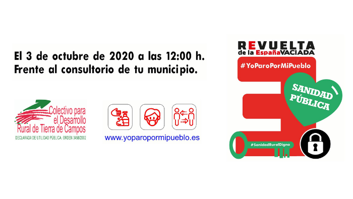 La España Vaciada volverá a movilizarse el próximo 3 de octubre con 5 minutos de concentración como ya lo hizo el año pasado. En esta ocasión la reivindicación se centrará en exigir una sanidad pública de calidad en el medio rural que garantice las mismas coberturas y prestaciones de que se dispone en las zonas urbanas, y que además atienda las especificidades de estos territorios. La concentración de esta nueva acción de la Revuelta de la España Vaciada se hará a las 12 del mediodía del sábado, 3 de octubre, frente a los consultorios médicos de los municipios y bajo los lemas #YoParoPorMiPueblo y #SanidadRuralDigna.