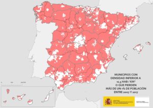 Mapa de España en el que están señalizados los municipios con una densidad inferior a 12,5 habitantes por kilómetro cuadrado o que han perdido más de un 1% anual de población entre 2007 y 2017.