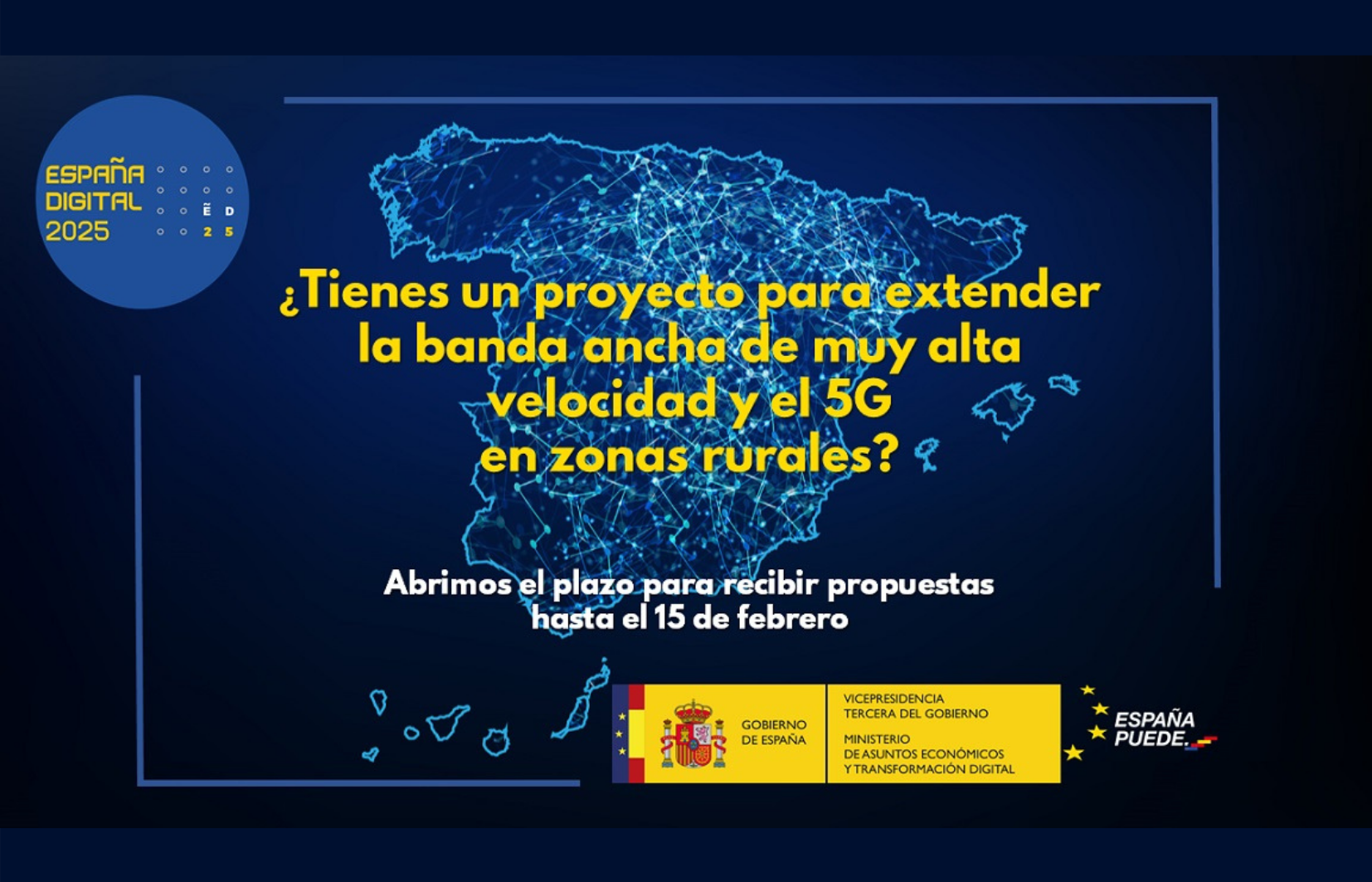 - La consulta se lanza en el contexto del Plan de Recuperación, Transformación y Resiliencia de la economía española, con el fin de obtener propuestas que, mediante la colaboración público-privada, permitan extender la banda ancha de muy alta velocidad y adelantar el despliegue de 5G en zonas poco pobladas