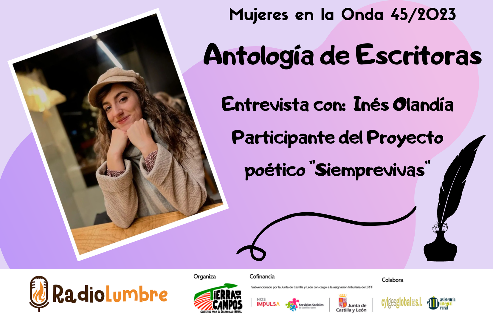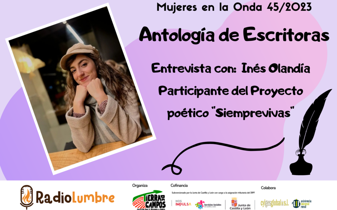 De ayer y de hoy. Escritoras que fueron, son y serán. Hoy hablamos con la joven poeta vallisoletana Inés Olandía, que viene a presentarnos un nuevo proyecto, «Siemprevivas. Antología poética solidaria» y también hablamos del proyecto interactivo de RTVE “Cómo el machismo marcó nuestra adolescencia” una herramienta digital fácil e interesante que nos recuerda cómo fueron los años de nuestra adolescencia. Accede a ella a través del siguiente enlace lab.rtve.es/8m-machismo-adolescencia/