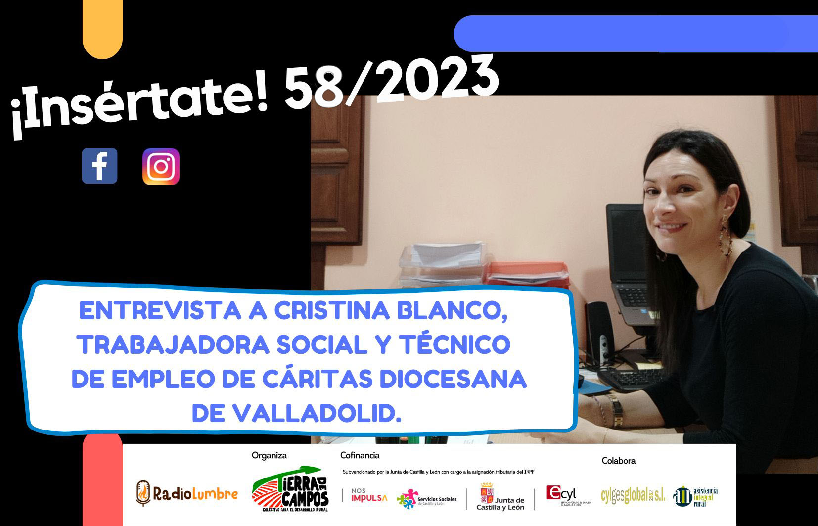 Hoy entrevistamos a Cristina Blanco Tomillo que es Trabajadora Social y Técnico de Empleo en el ámbito rural de la zona de tierra de campos en CÁRITAS DIOCESANA de Valladolid en su sede de Medina de Rioseco, municipio del que ella es natural. Charlaremos con ella como experta en empleo e inclusión, ya que ambos son necesidades que van de la mano y son fundamentales para el desarrollo de la persona y de la comunidad a la que pertenece.
