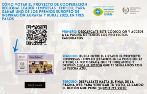 Junto a estas categorías, se otorgará un Premio por voto popular. Desde los once Grupos de Acción Local que trabajan en red para fomentar la generación de empleo y emprendimiento, en el marco LEADER, se anima a votar el proyecto “+Empresas +Empleo”. El voto se podrá realizar hasta el 1 de diciembre a las 18:00 horas a través del siguiente enlace: https://www.surveymonkey.com/r/6TK3DJS