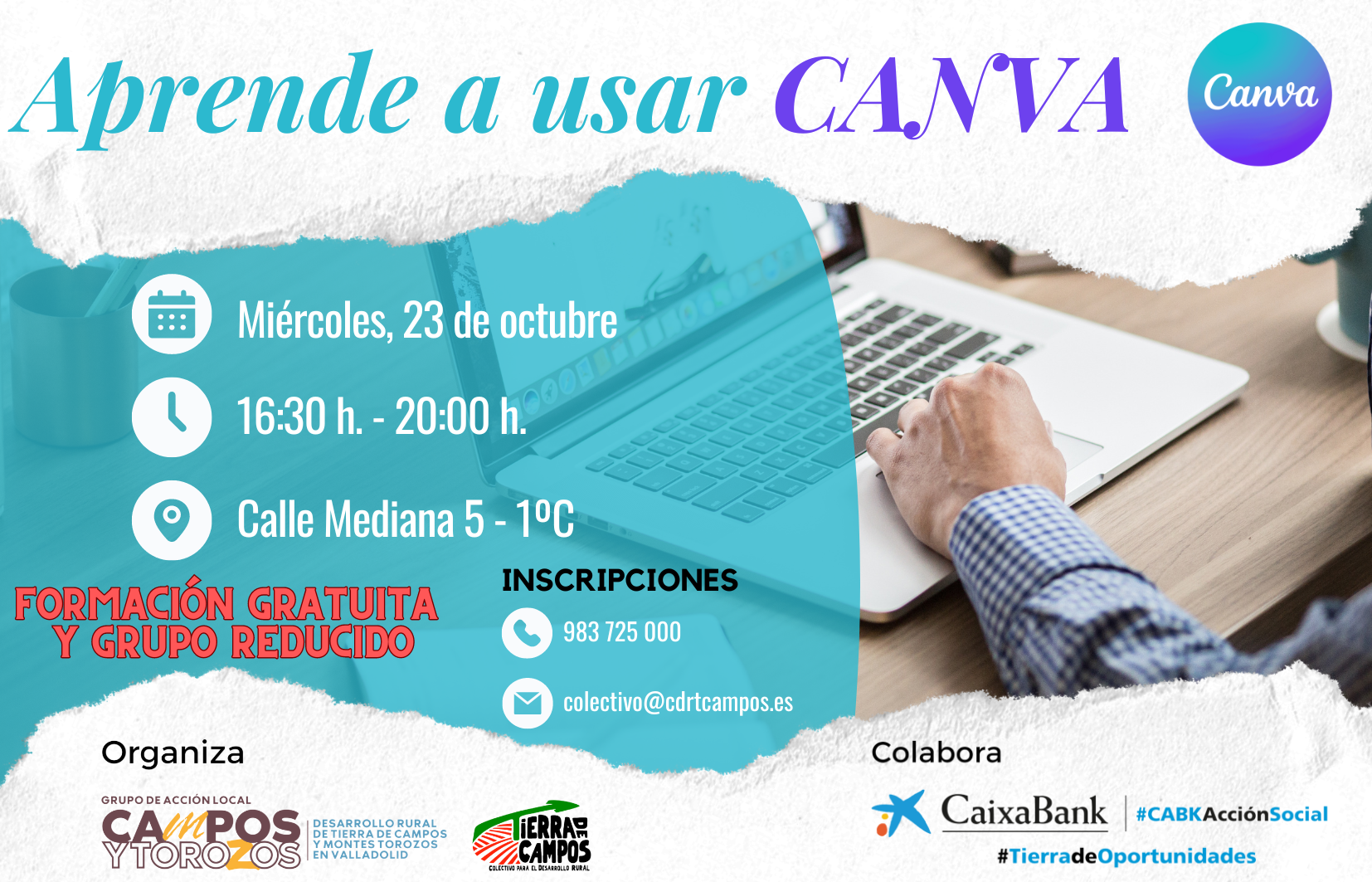 - El Grupo de Acción Local ‘Campos y Torozos’, gestionado por la Asociación Colectivo para el Desarrollo Rural de Tierra de Campos’ organiza una formación para aprender a usar la herramienta de diseño CANVA que se realizará el próximo miércoles 23 de octubre de 2024