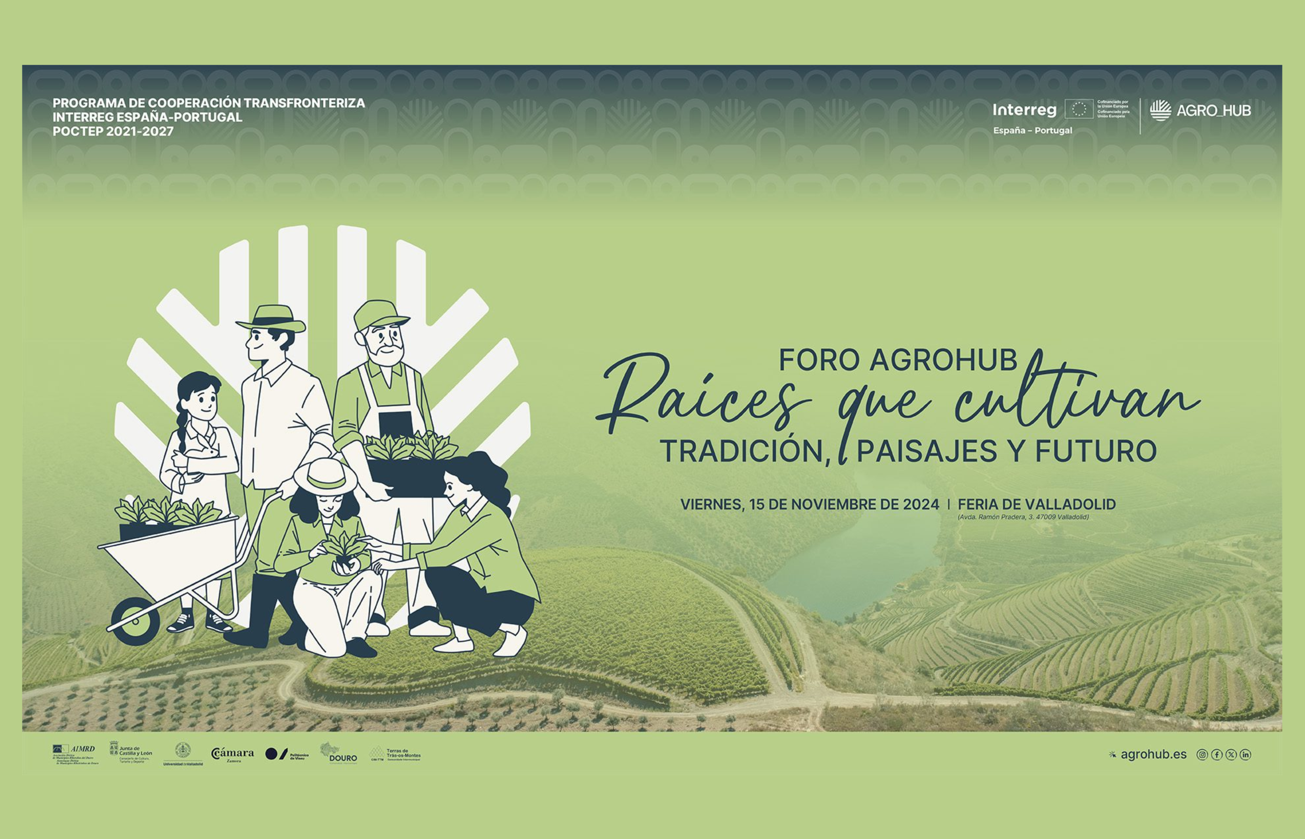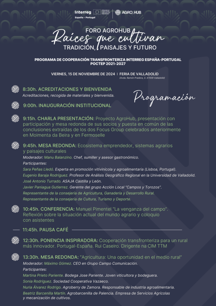 El Foro AgroHUB es un evento que busca fortalecer la cooperación entre productores locales en la región transfronteriza entre Castilla y León y el Norte de Portugal, promoviendo sistemas de producción alimentaria sostenibles. Bajo el lema “Raíces que cultivan” se desarrollará el próximo 15 de noviembre el Foro AgroHub, que tendrá lugar en la Feria de Muestras de Valladolid.
