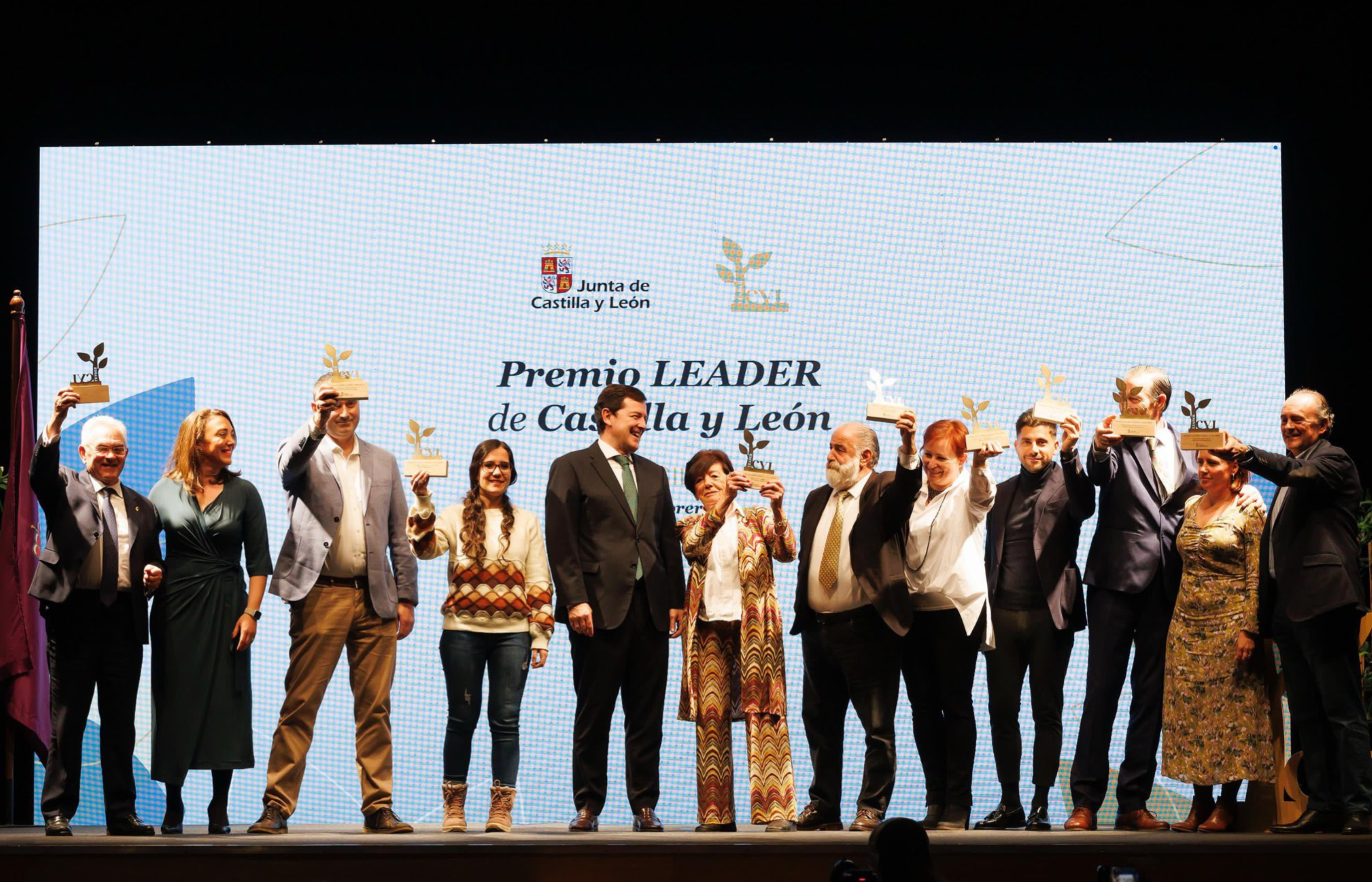 El presidente, David Esteban Rodríguez, junto al equipo técnico del Grupo de Acción Local (GAL) ‘Campos y Torozos’, gestionado por la Asociación Colectivo para el Desarrollo Rural de Tierra de Campos han asistido a la entrega de premios, que tuvo lugar ayer, 19 de febrero, en la localidad de Tordesillas (Valladolid). El evento ha contado con la participación del presidente de la Junta de Castilla y León, Alfonso Fernández Mañueco, quien ha querido poner en valor la importancia de LEADER y la labor de los grupos de acción local en la región. «Los Grupos de Acción Local tenéis una fuerza enorme. Cada euro de ayuda LEADER multiplica por tres y medio la inversión total. Me pregunto cómo es posible que no se hiciesen antes unos premios de estas características», ha declarado.