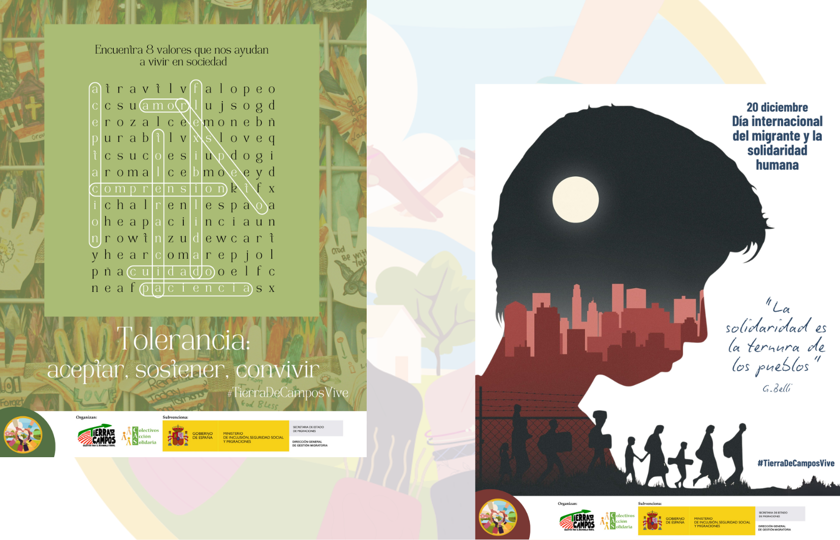 Junto con los “Encuentros para la Convivencia”, realizados en Medina de Rioseco y Villafrechós en los meses de octubre a diciembre, entre la población local y migrante asentada en cada uno de los dos municipios, y en los que se han compartido cultura, estilos de vida, saberes y gustos en torno a manualidades de costura y de gastronomía; también se publicaron en este otoño dos campañas de sensibilización en nuestras redes sociales y nuestra publicación mensual “La Mar de Campos”. En estas últimas campañas del año, acogemos dos valores importantes para la integración efectiva de las personas migrantes en nuestra comarca, que tienen que ver con el trabajo que individual y socialmente es necesario hacer por la parte acogedora: la tolerancia y la solidaridad.